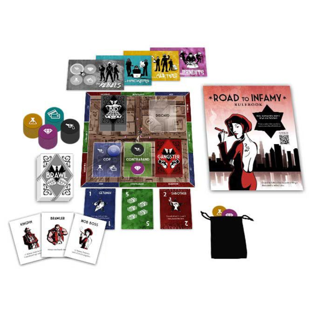 Road to Infamy es un juego de pujas trepidante con temática de gánsteres para 2-4 jugadores. Road to Infamy se centra en anticipar los movimientos de tus oponentes, asumir riesgos y realizar contraataques. Es tan sencillo que se aprende en 3 minutos, pero lo suficientemente profundo como para descubrir nuevas estrategias cada vez que juegas. Pero lo mejor de todo es que siempre es tu turno.
