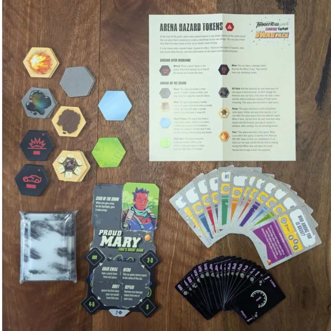 Cabe destacar que el paquete incluye fundas adicionales para Carnaval del Caos y todas las cartas del paquete, con el mismo estilo que las fundas de Thunder Road: Vendetta.